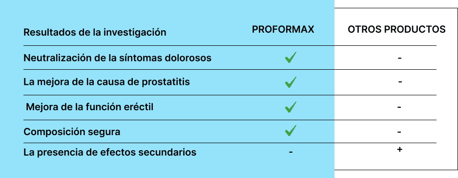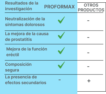 Según los hallazgos de la conferencia sobre la salud del hombre, la incidencia de prostatitis entre la población boliviana ha aumentado un 25% en los últimos tres años. Y la enfermedad está afectando a una generación más joven. PROFormax es un nuevo producto para la prostatitis. Estudiamos los componentes bioactivos en su estado natural, los combinamos y evaluamos sus efectos en varias combinaciones. Finalmente, pudimos identificar una mezcla de componentes que funcionan sinérgicamente en el sistema genitourinario, complementándose entre sí. PROFormax mejora la erección y la libido, alivia la inflamación de los órganos pélvicos, normaliza el funcionamiento del sistema genitourinario y ayuda a inhibir el crecimiento del adenoma de próstata, lo que reduce el riesgo de cáncer debido a la influencia de componentes naturales.